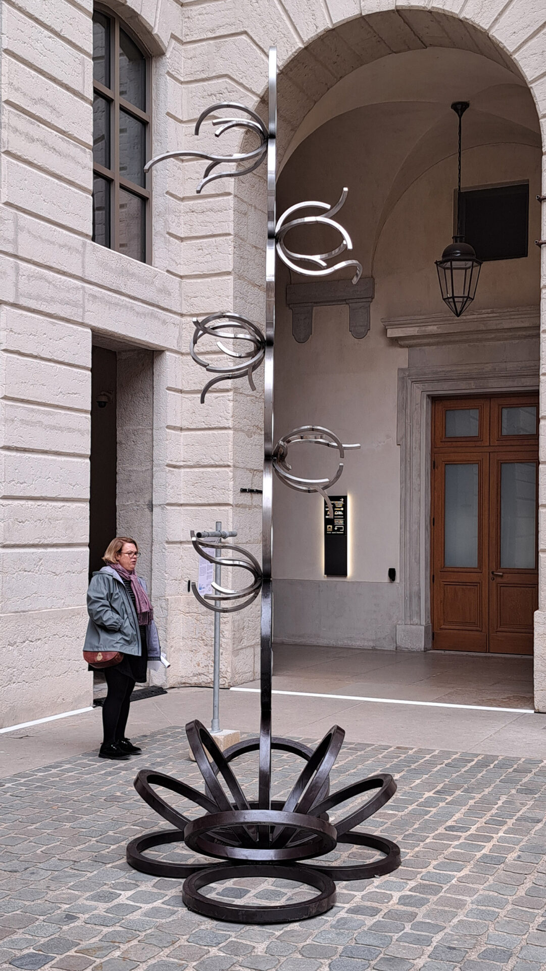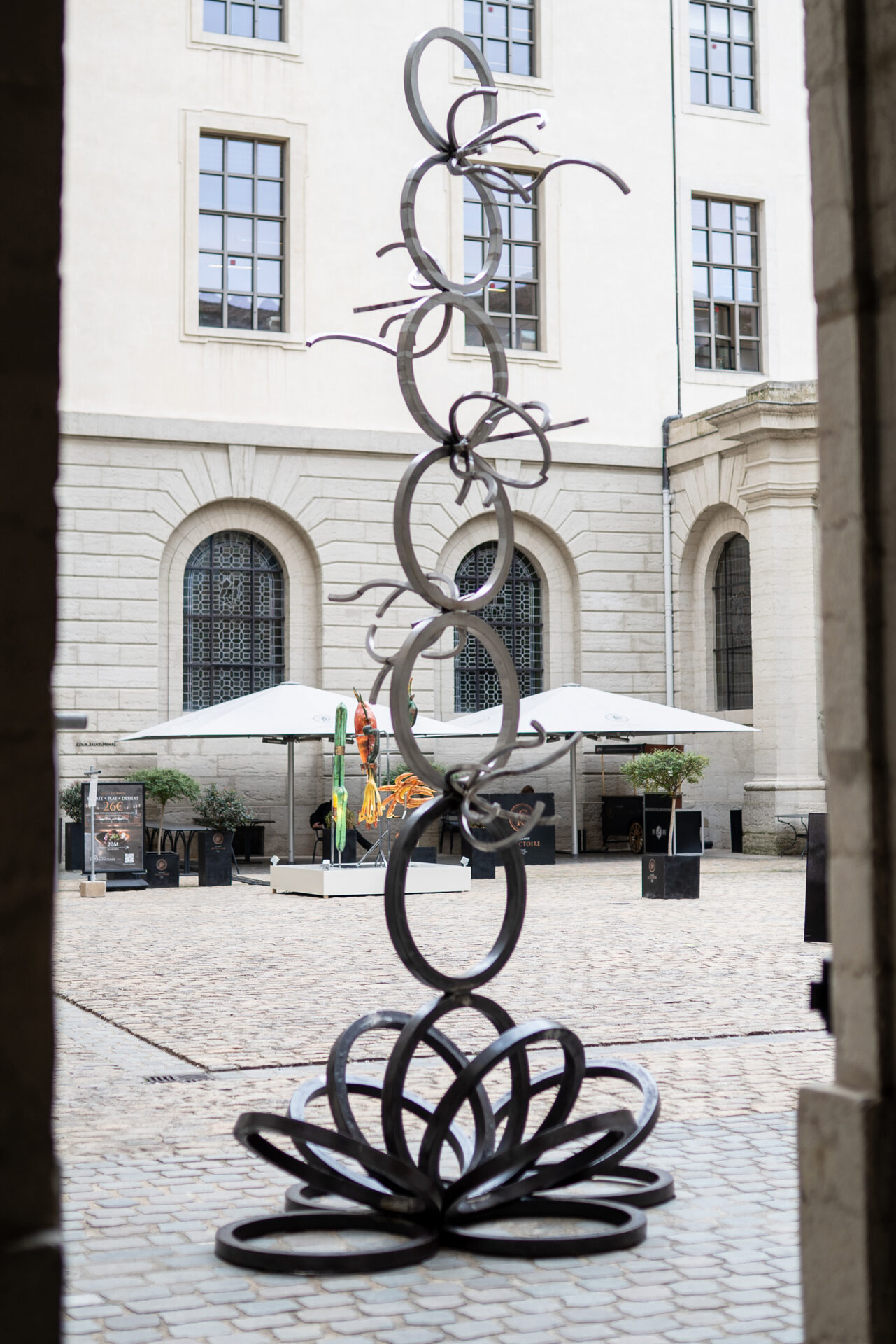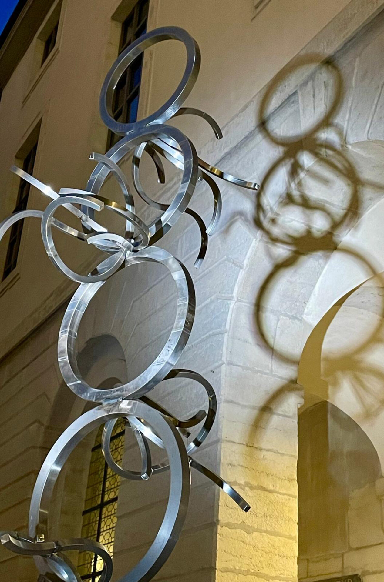 L’ œuvre dialogue aussi avec l’identité du groupe ACI, qui réunit des entreprises aux savoir-faire complémentaires. La sculpture a été ouvragée dans Les Forges de Monplaisir, l’ entreprise de soudage Berthier Alpes et de chromage Rectichrome. Chaque couronne devient alors un maillon : une unité unique, articulée à l’ ensemble. En filigrane, la sculpture esquisse une métaphore du collectif – où diversité rime avec cohérence, et transformation avec mise en commun.