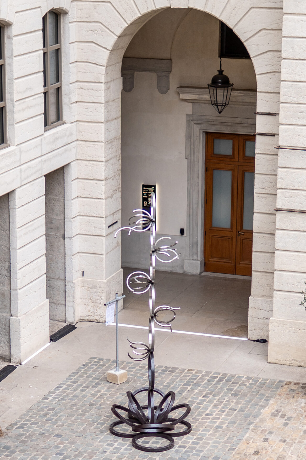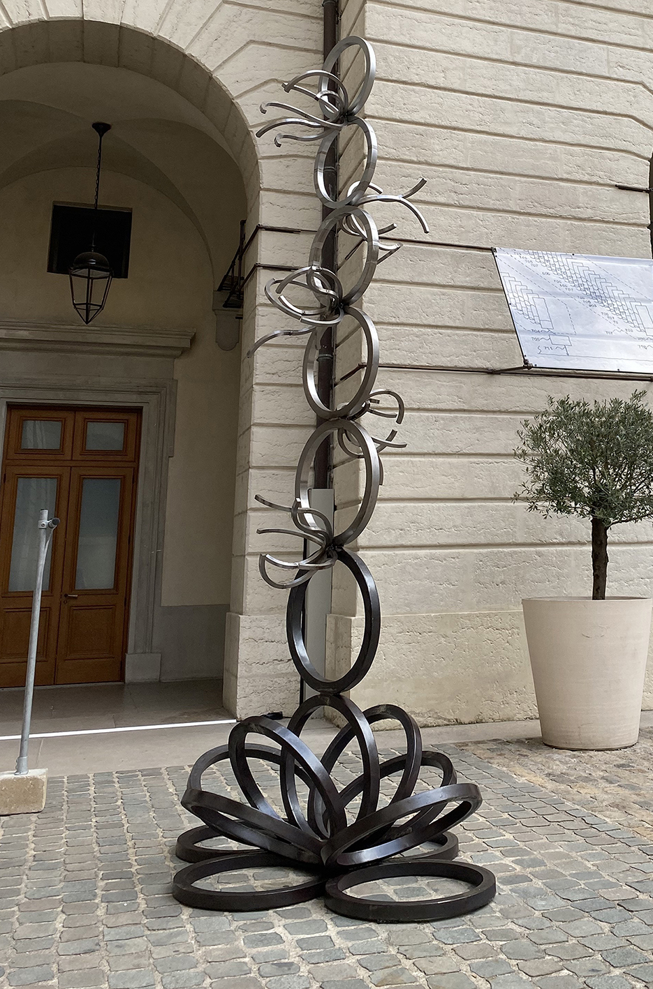 La sculpture s ’élève comme une tige, composée d’ un empilement de couronnes aux finitions multiples – acier brut, brossé, poli et chromé. Vue de face, elle révèle l’ alignement parfait des cercles. De profil, elle se mue en une ligne élancée, évoquant une croissance végétale.